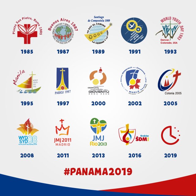 No Twitter, além de lançar o símbolo, o perfil da JMJ Panamá 2019 (@jmj_pt) divulgou o histórico das logos do evento.